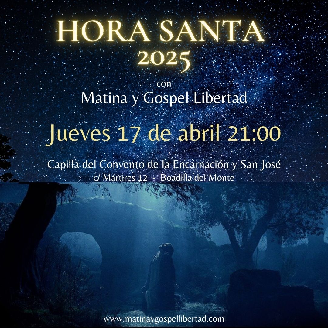 Celebra la Hora Santa 2025 con Matina y Gospel Libertad el jueves 17 de abril de 2025 a las 21:00 en el Convento de la Encarnación  y San José de la Carmelitas descalzas de Boadilla del monte