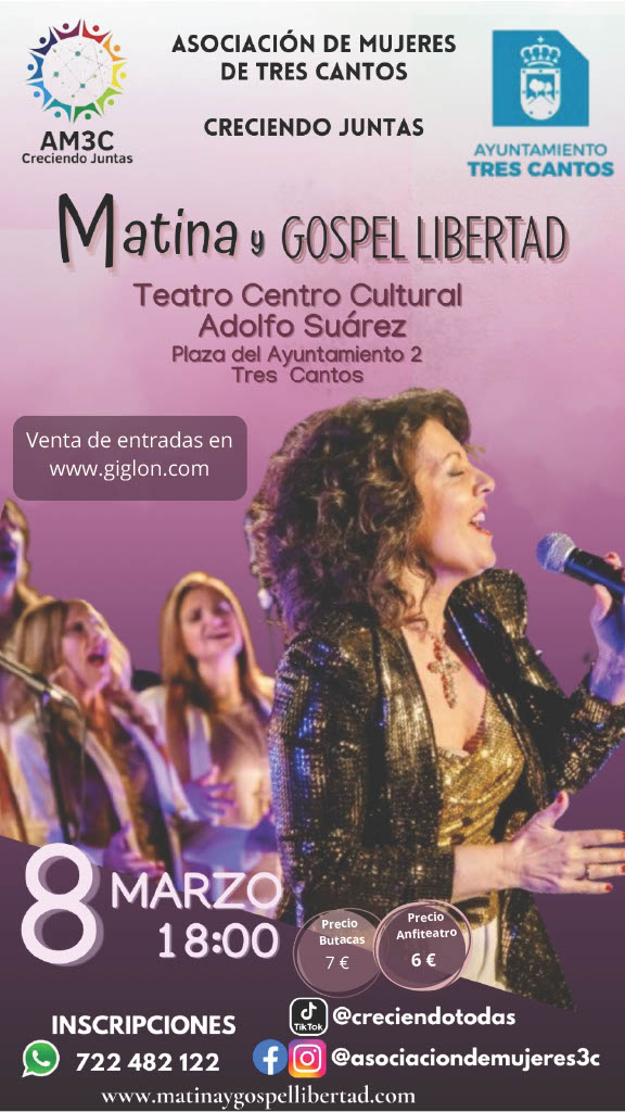 El domingo 8 de marzo de 2026 a las 18:00 horas tendrá lugar el esperado Concierto de Matina y Gospel Libertad en el Centro Cultural Adolfo Suárez de Tres Cantos (Madrid)